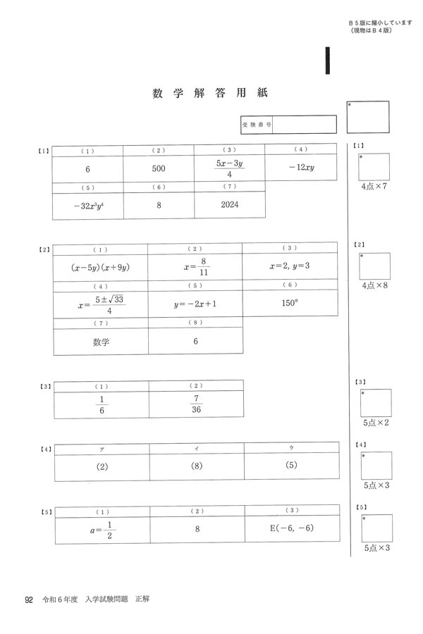令和6年度入試過去問題(数学 解答)(1ページ目)|神戸龍谷高等学校の入試過去問