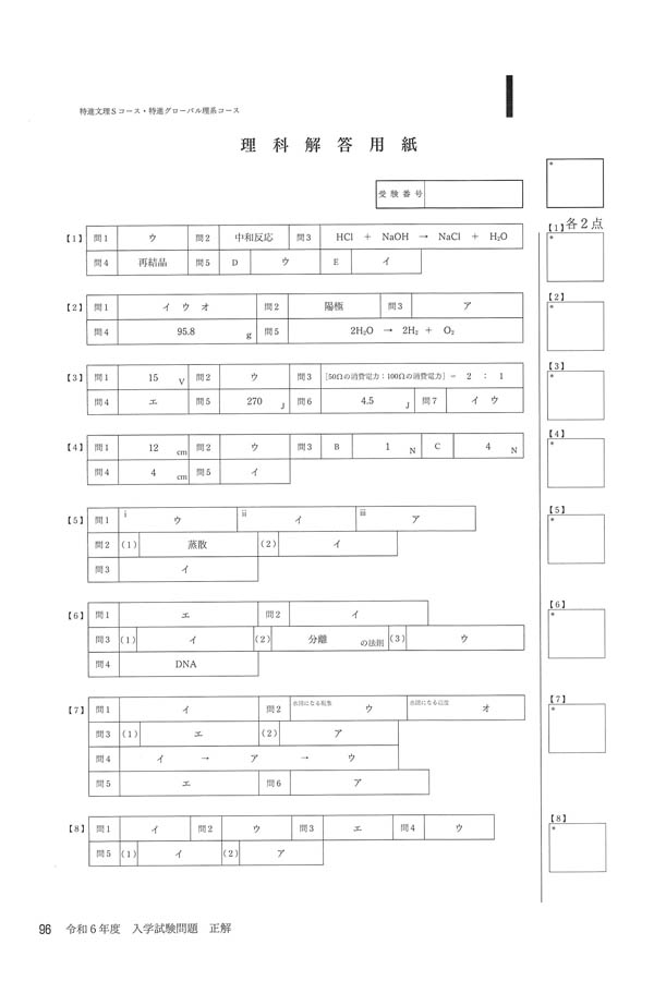 令和6年度入試過去問題 特進文理Sコース・特進グローバル理系コース(理科 解答)(1ページ目)|神戸龍谷高等学校の入試過去問