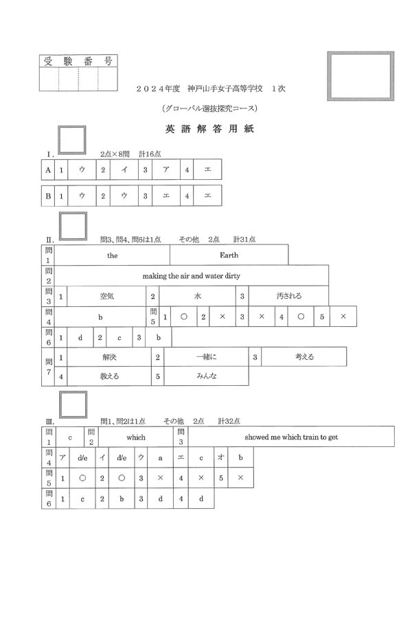 2024年度入試過去問題<グローバル選抜探究コース>(英語 解答)(1ページ目)|神戸山手グローバル高等学校の入試過去問