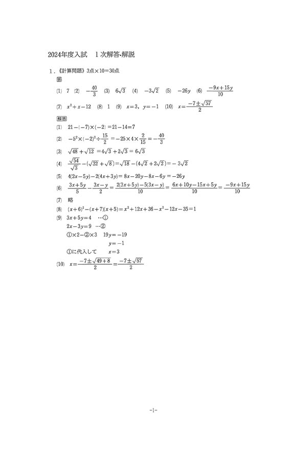2024年度入試過去問題(数学 解答)(1ページ目)|神戸山手グローバル高等学校の入試過去問
