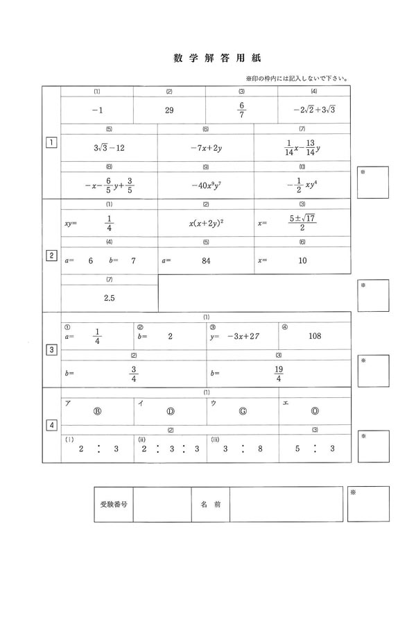 2020年度入試過去問題(数学 解答)(1ページ目)|神戸学院大学附属高等学校の入試過去問