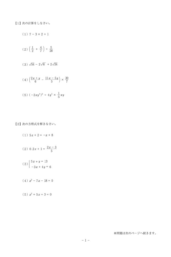 令和6年度入試過去問題(数学 問題)(1ページ目)|神戸星城高等学校の入試過去問