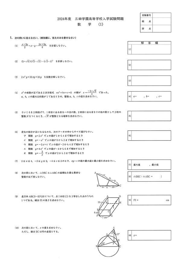2024年度入試過去問題(数学 問題)(1ページ目)|三田学園高等学校の入試過去問