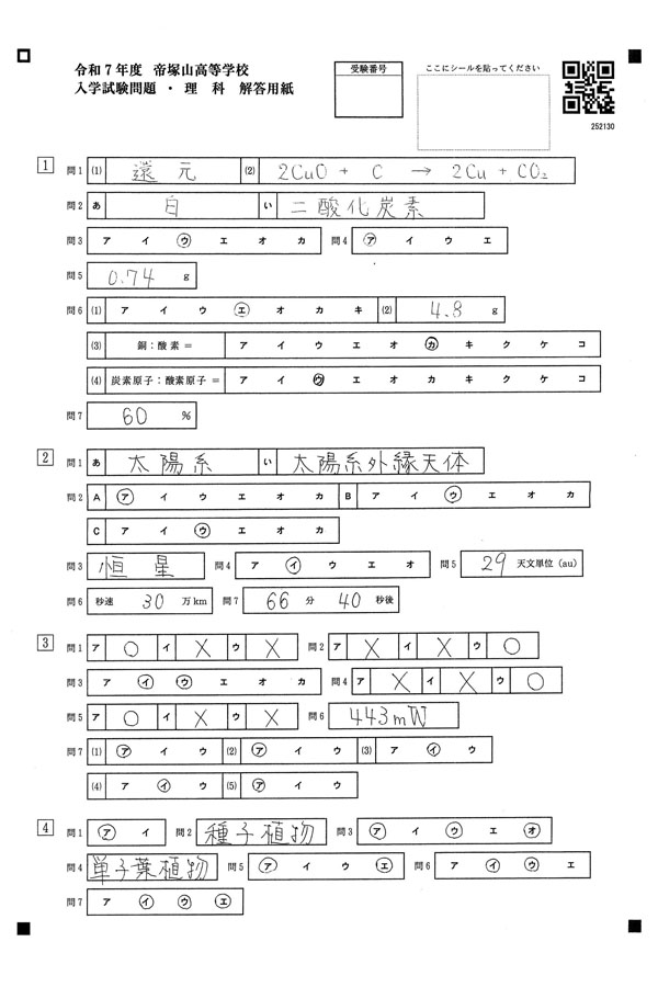 令和7年度入試過去問題(理科 解答)(1ページ目)|帝塚山高等学校の入試過去問