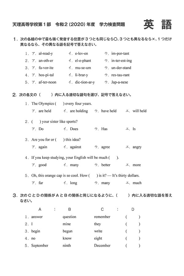 入試過去問(問題)(1ページ目)|天理高等学校の入試過去問