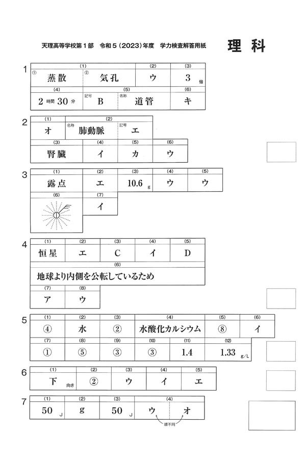 2023年度入試過去問題(理科 解答)(1ページ目)|天理高等学校の入試過去問