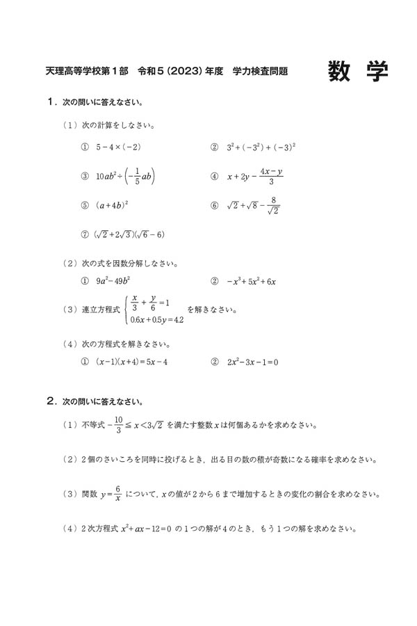 入試過去問(問題)(1ページ目)|天理高等学校の入試過去問