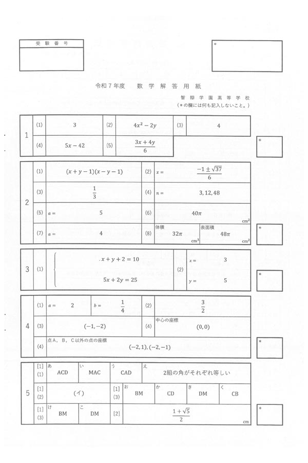 令和7年度入試過去問題(数学 解答)(1ページ目)|智辯学園高等学校の入試過去問
