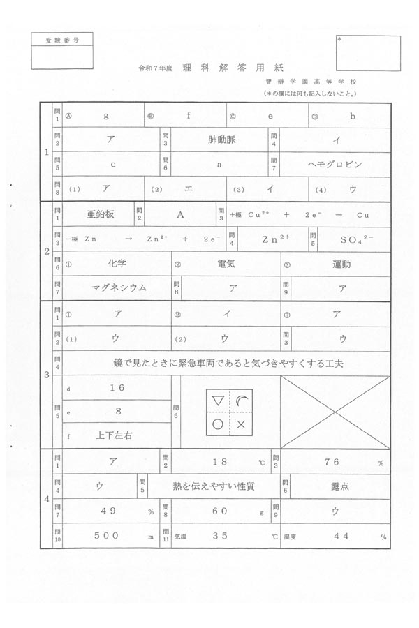 令和7年度入試過去問題(理科 解答)(1ページ目)|智辯学園高等学校の入試過去問