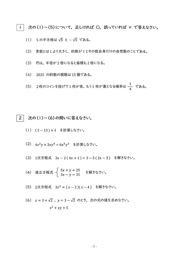 令和7年度入試過去問題(数学 問題)(1ページ目)|奈良文化高等学校の入試過去問