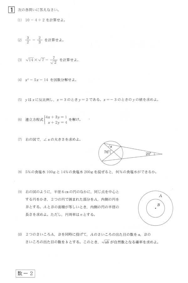 平成23年度入試過去問題(数学 問題)(1ページ目)|鹿児島高等学校の入試過去問