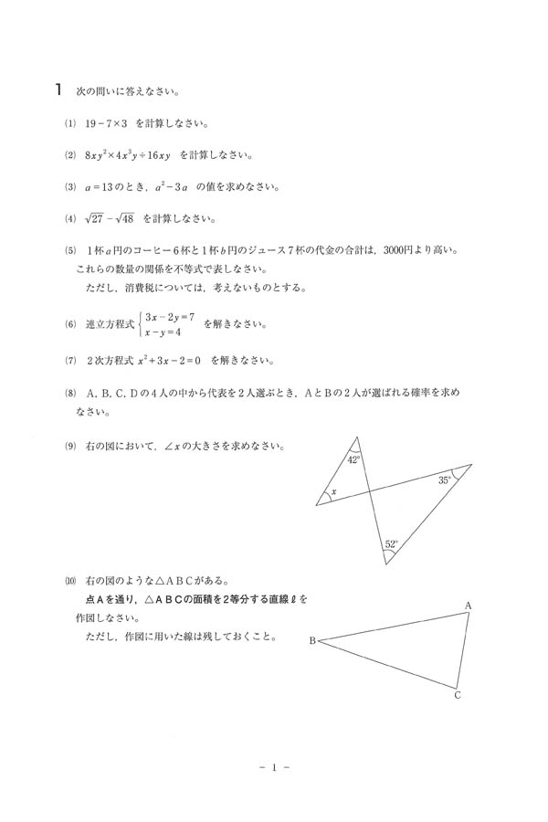 令和6年度入試過去問題(数学 問題)(1ページ目)|高岡向陵高等学校の入試過去問