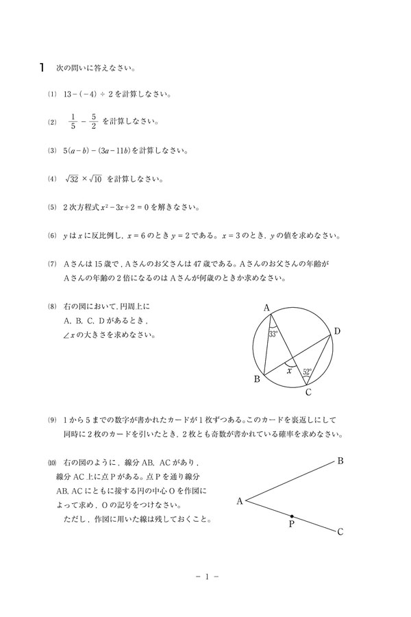 令和7年度入試過去問題(数学 問題)(1ページ目)|高岡向陵高等学校の入試過去問