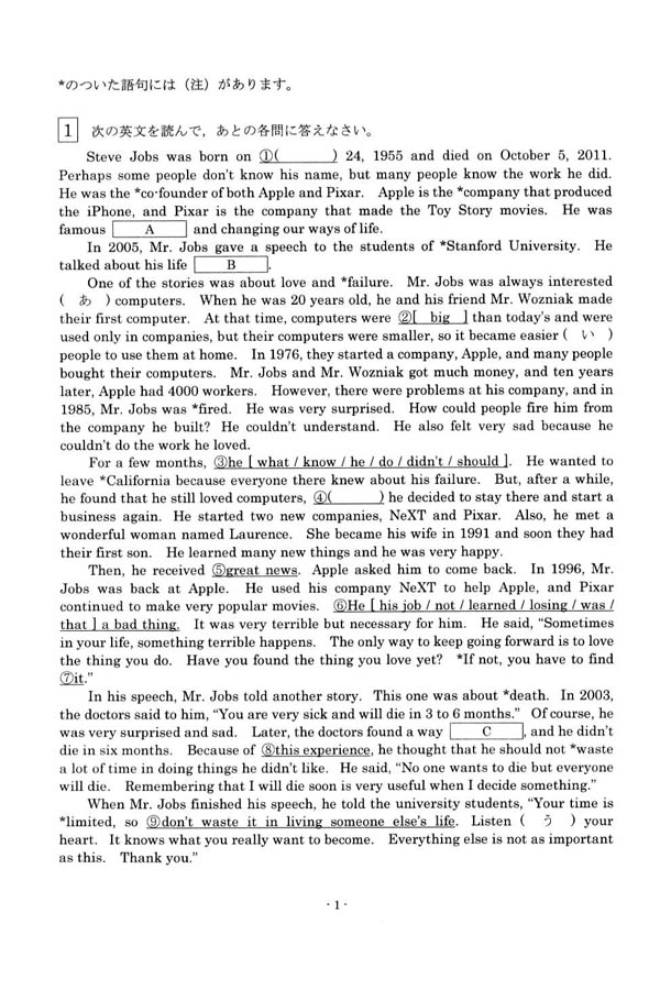 平成26年度入試過去問題(英語 問題)(1ページ目)|金沢高等学校の入試過去問
