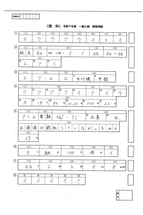 令和7年度入試過去問題(一般)(理科 解答)(1ページ目)|北陸高等学校の入試過去問