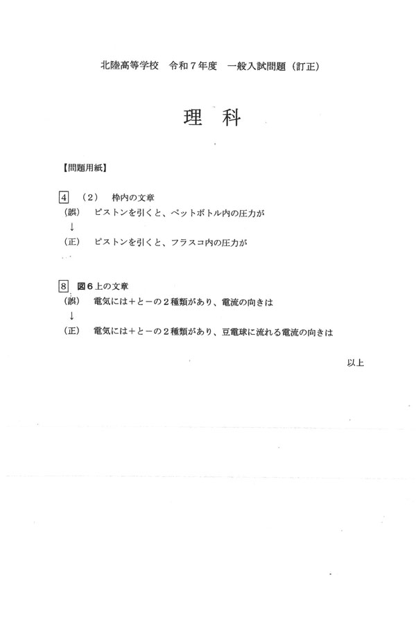 令和7年度入試過去問題(一般)(理科 問題)(1ページ目)|北陸高等学校の入試過去問