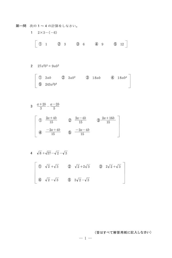 2020年度入試過去問題 A日程(数学 問題)(1ページ目)|仙台育英学園高等学校の入試過去問