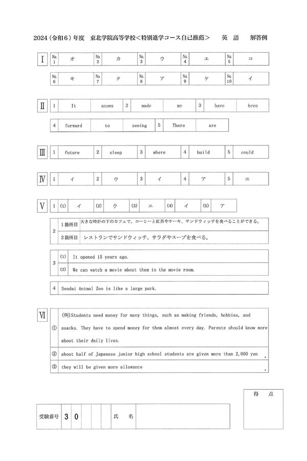 2024年度入試過去問題 特別進学コース自己推薦(英語 解答)(1ページ目)|東北学院高等学校の入試過去問