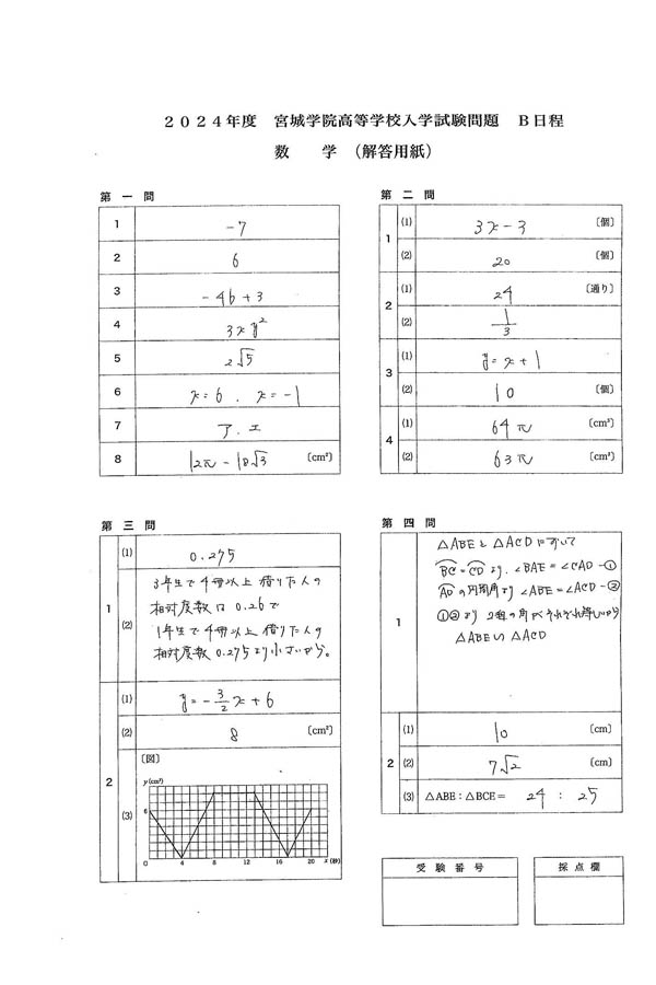 2024年度入試過去問題 B日程(数学 解答)(1ページ目)|宮城学院高等学校の入試過去問
