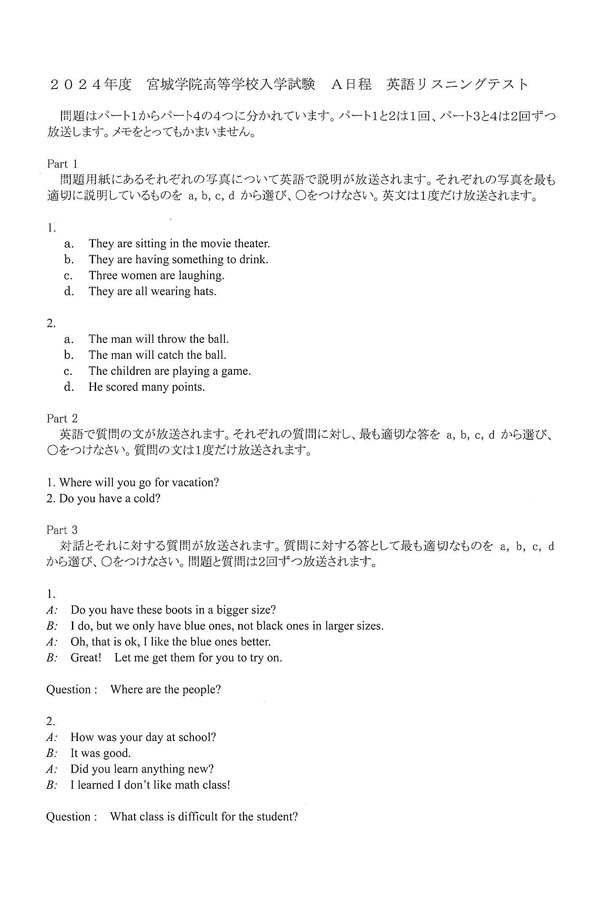 2024年度入試過去問題 A日程(英語 問題)(1ページ目)|宮城学院高等学校の入試過去問