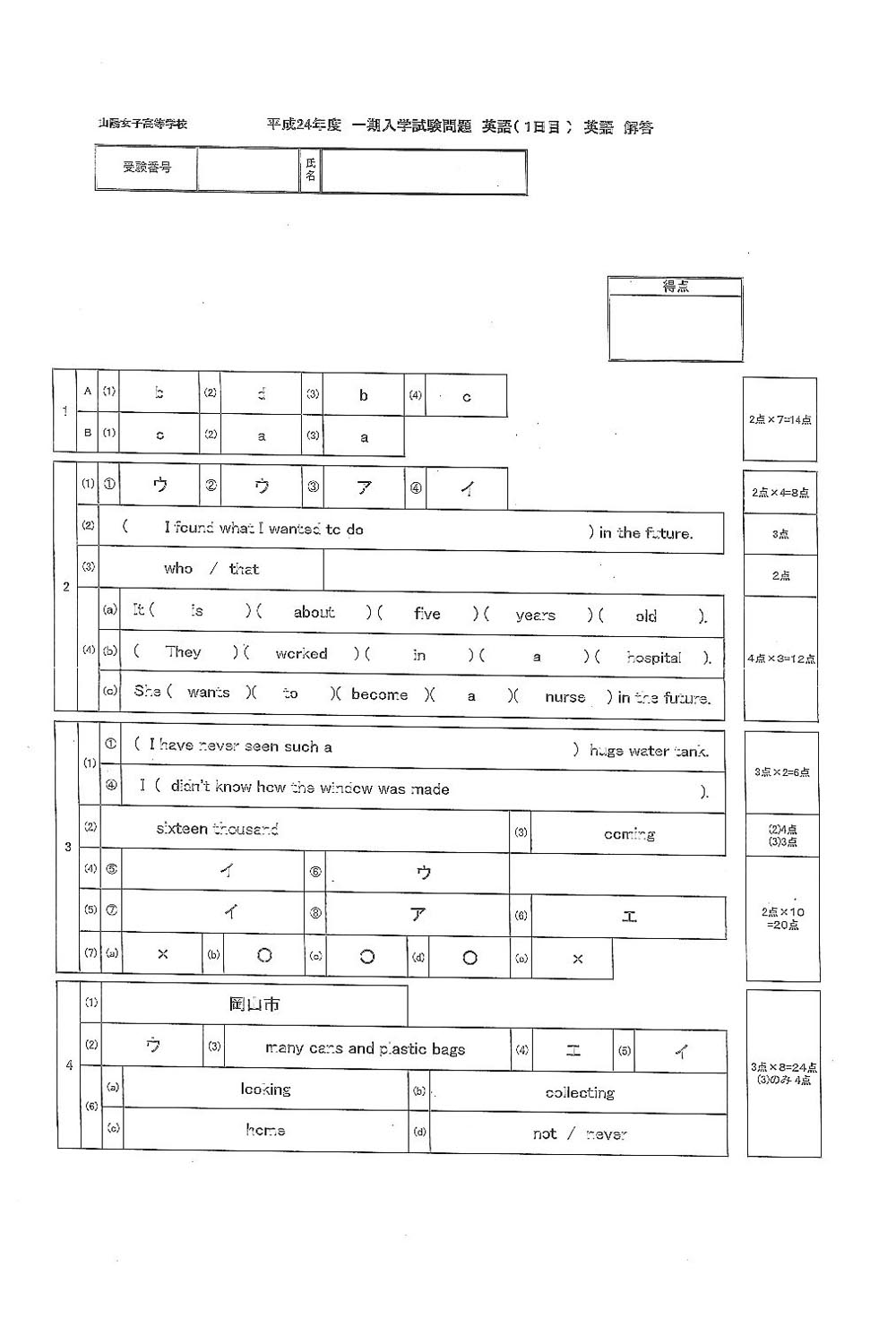 平成24年度入試過去問題 1日目(英語 解答)(1ページ目)|山陽学園高等学校の入試過去問
