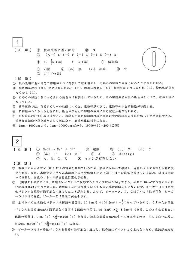 令和7年度入試過去問題(1期・1月24日)(理科 解答)(1ページ目)|岡山学芸館高等学校の入試過去問