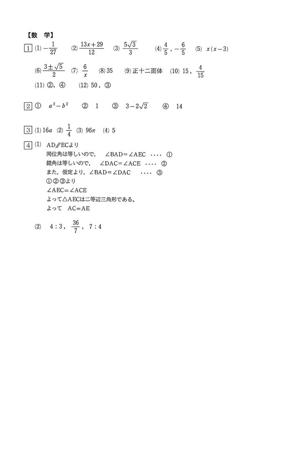 令和7年度入試過去問題(県外)(数学 解答)(1ページ目)|金光学園高等学校の入試過去問