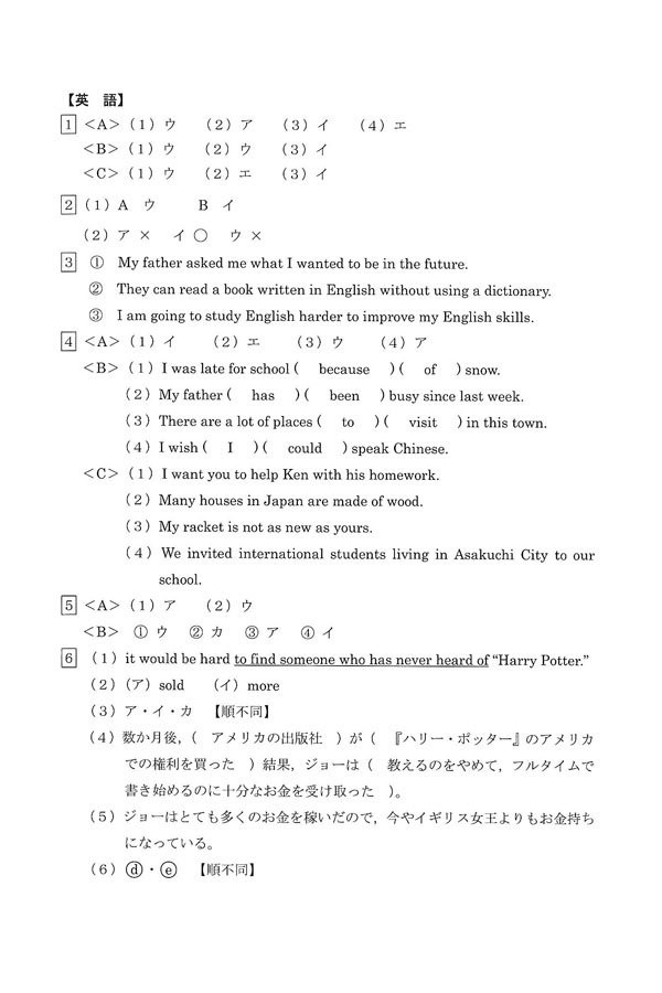 令和7年度入試過去問題(統一日)(英語 解答)(1ページ目)|金光学園高等学校の入試過去問