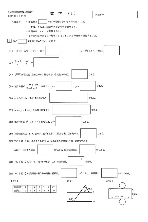 令和7年度入試過去問題(統一日)(数学 問題)(1ページ目)|金光学園高等学校の入試過去問