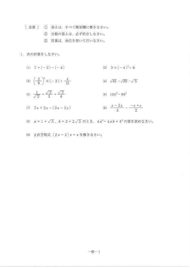 2021年度入試過去問題 一般入試 一般コース(数学 問題)(1ページ目)|広島県瀬戸内高等学校の入試過去問