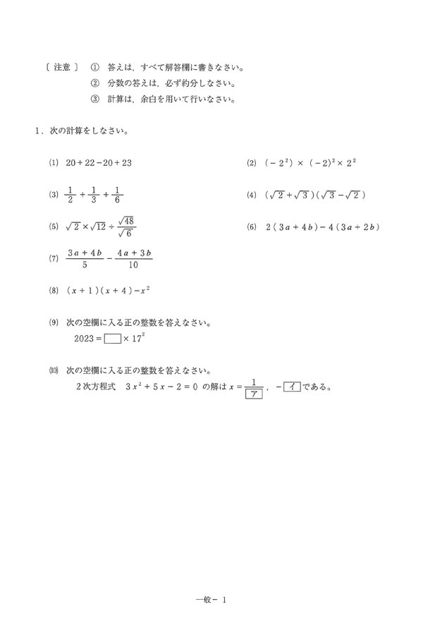 2023年度入試過去問題 推薦入試 一般コース(数学 問題)(1ページ目)|広島県瀬戸内高等学校の入試過去問