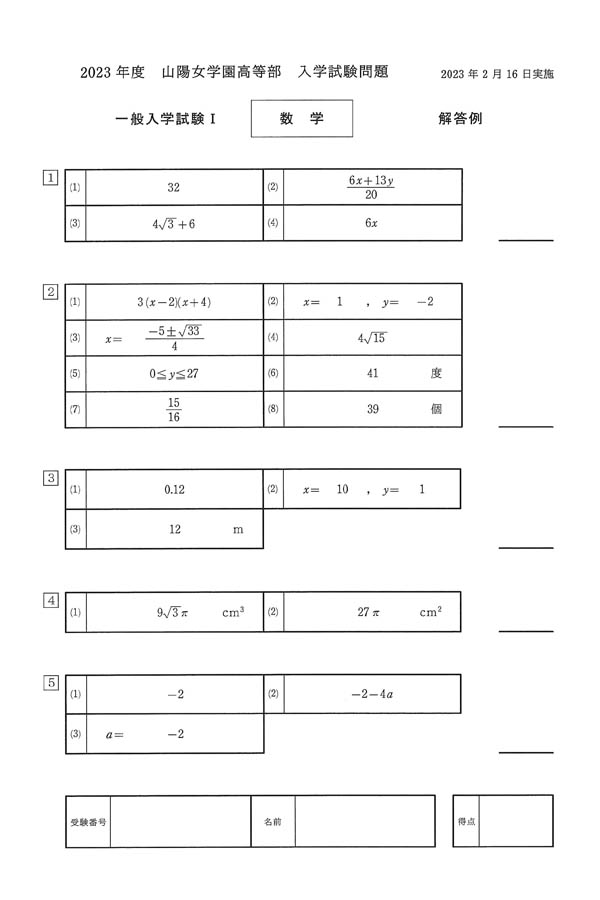 2023年度入試過去問題 一般I(数学 解答)(1ページ目)|山陽女学園高等部の入試過去問