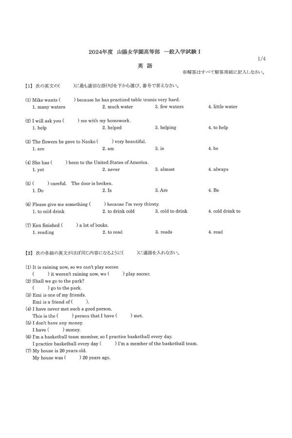 2024年度入試過去問題 一般I(英語 問題)(1ページ目)|山陽女学園高等部の入試過去問