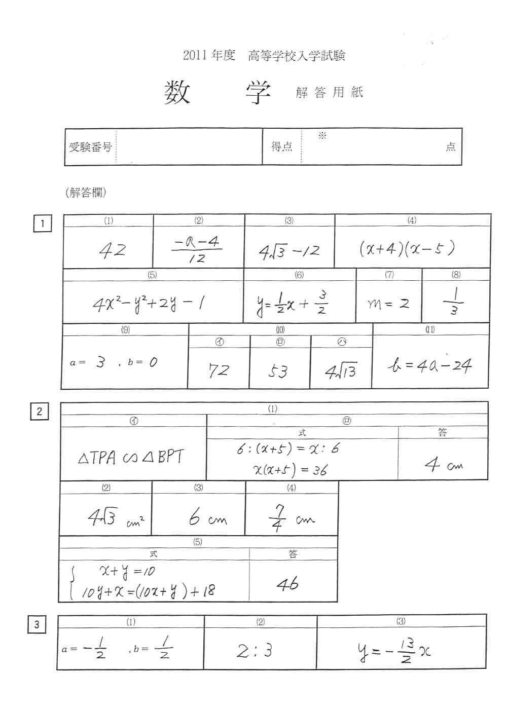 平成23年度入試過去問題(数学 解答)(1ページ目)|東京家政学院高等学校の入試過去問