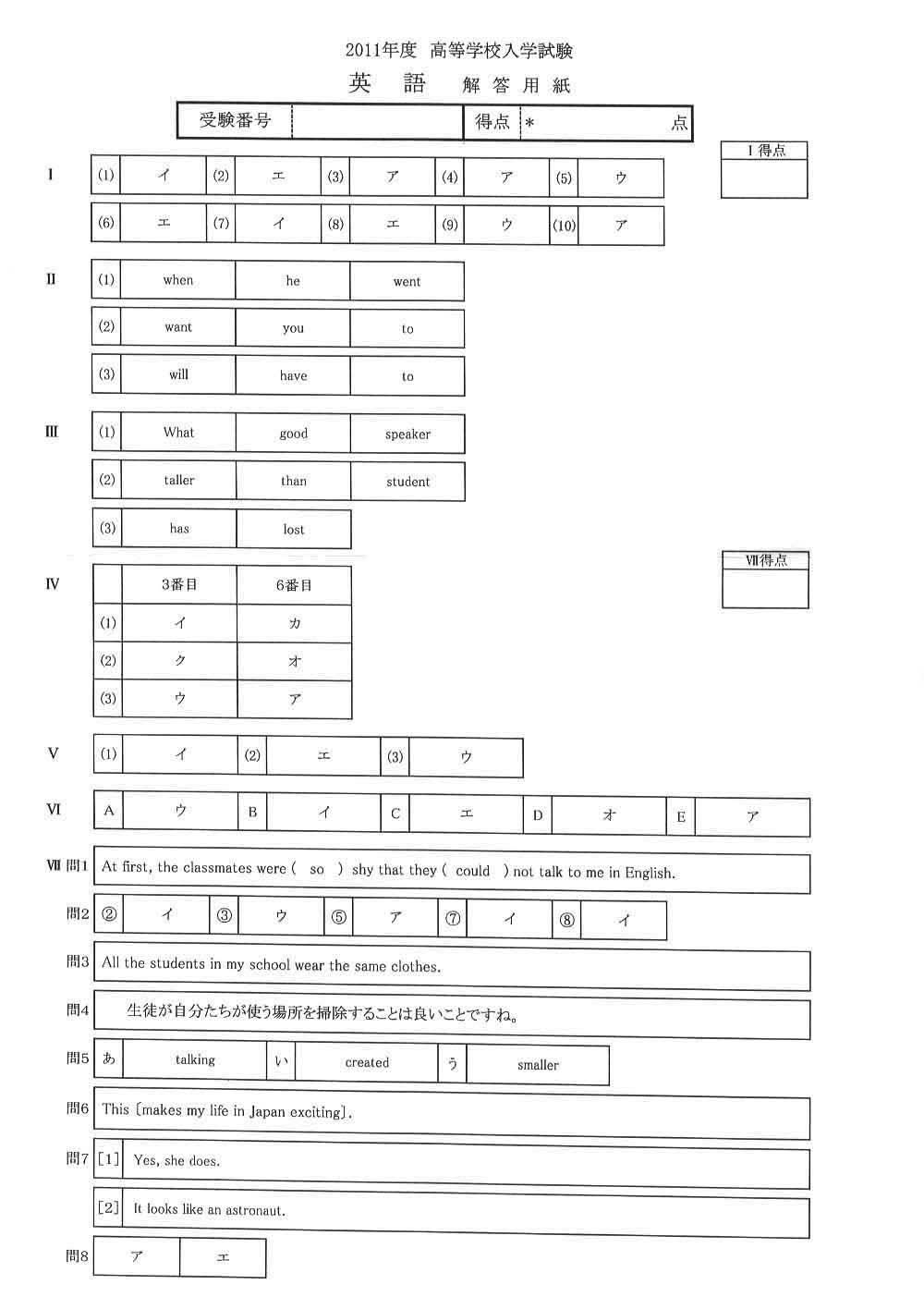 平成23年度入試過去問題(英語 解答)(1ページ目)|東京家政学院高等学校の入試過去問