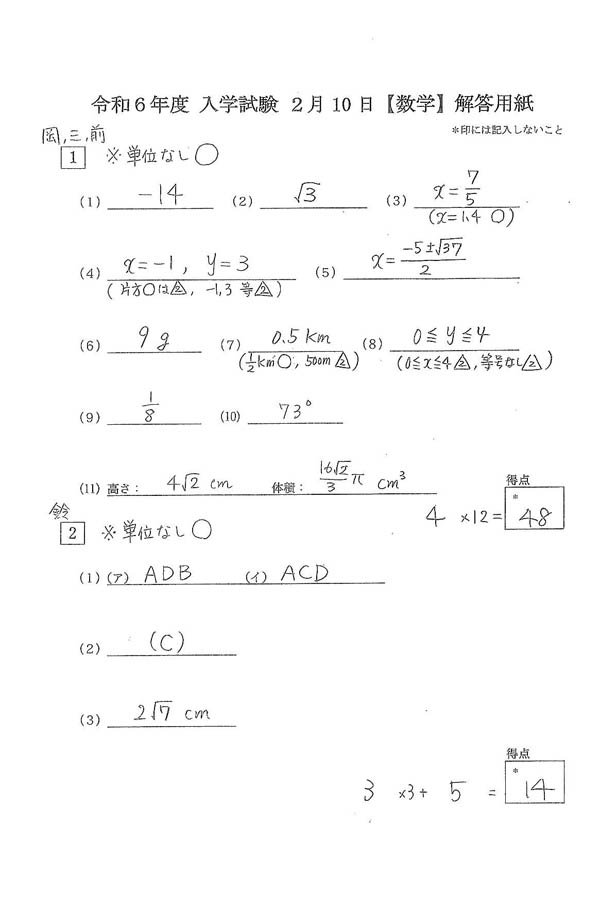 令和6年度入試過去問題 2月10日 (数学 解答)(1ページ目)|保善高等学校の入試過去問