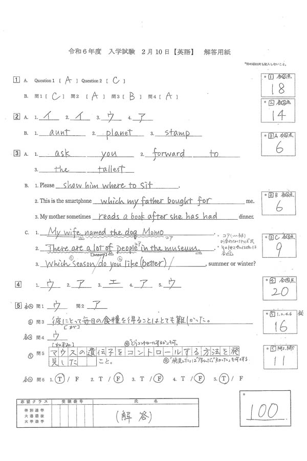 令和6年度入試過去問題 2月10日 (英語 解答)(1ページ目)|保善高等学校の入試過去問