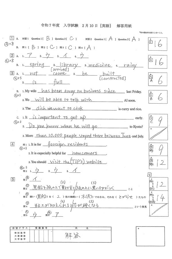令和7年度入試過去問題 2月10日(英語 解答)(1ページ目)|保善高等学校の入試過去問