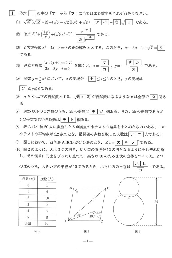 2025年度入試過去問題 第2回(数学 問題)(1ページ目)|国学院高等学校の入試過去問