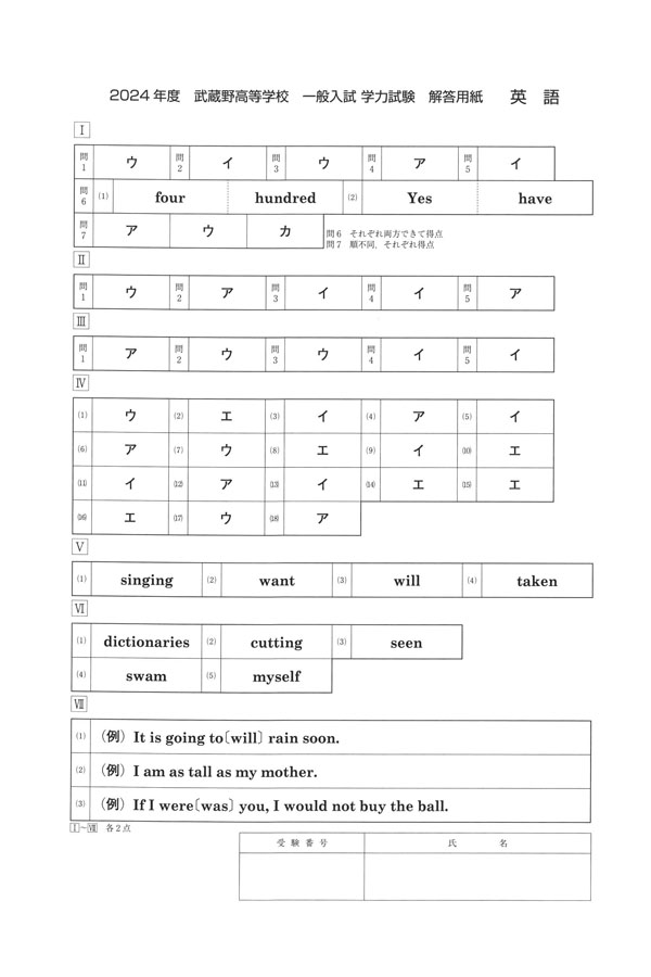2024年度入試過去問題 一般(英語 解答)(1ページ目)|武蔵野高等学校の入試過去問