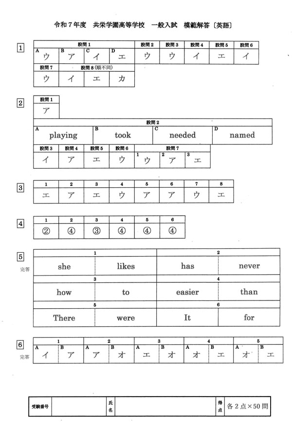 令和7年度入試過去問題(一般入試)(英語 解答)(1ページ目)|共栄学園高等学校の入試過去問