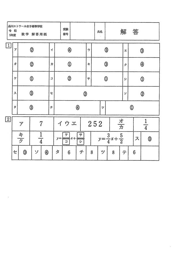 令和5年度入試過去問題(数学 解答)(1ページ目)|品川エトワール女子高等学校の入試過去問