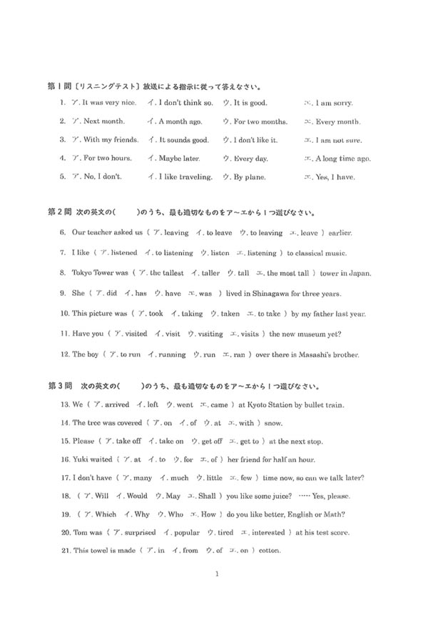2021年度入試過去問題 第2回(英語 問題)(1ページ目)|品川エトワール女子高等学校の入試過去問