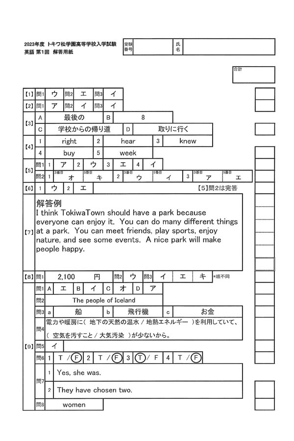2023年度入試過去問題 第1回(英語 解答)(1ページ目)|トキワ松学園高等学校の入試過去問