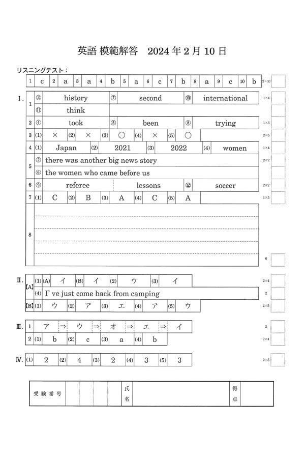 2024年度入試過去問題 (英語 解答)(1ページ目)|玉川聖学院高等部の入試過去問