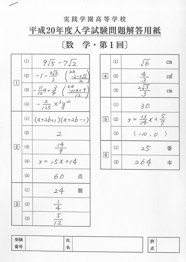 平成20年度入試過去問題第1回(数学 解答)(1ページ目)|実践学園高等学校の入試過去問