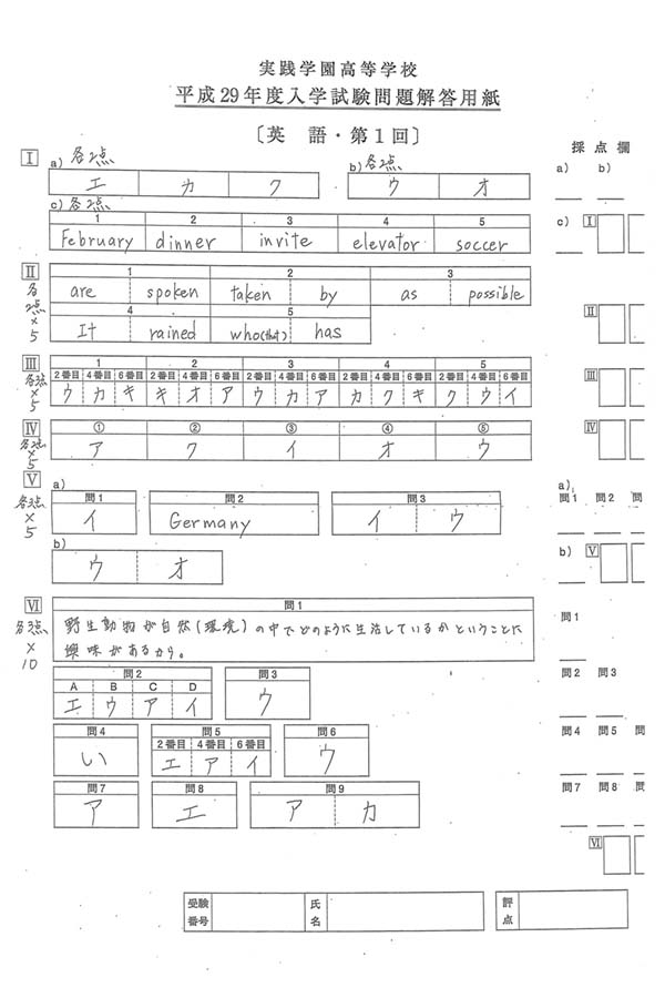 平成29年度入試過去問題 第1回(英語 解答)(1ページ目)|実践学園高等学校の入試過去問