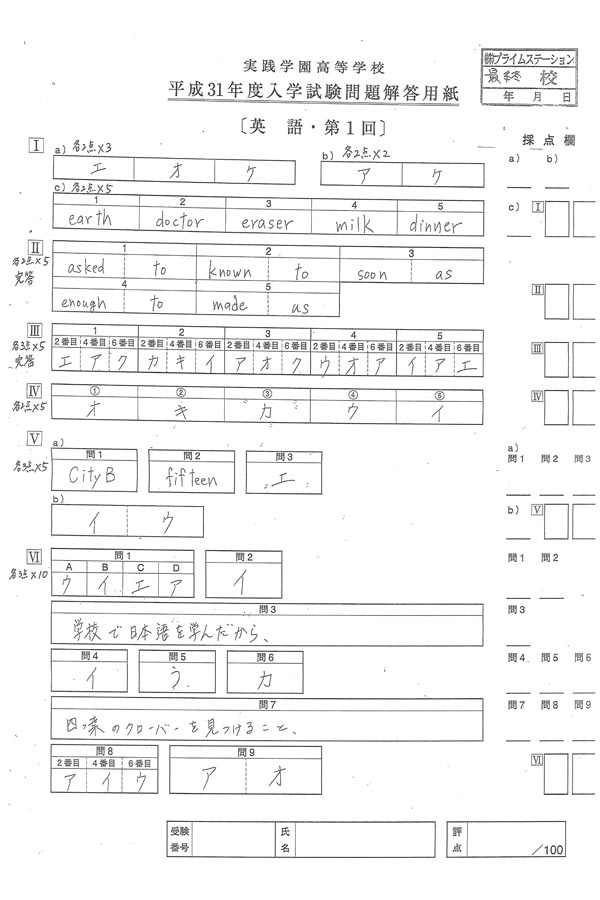 平成31年度入試過去問題 第1回(英語 解答)(1ページ目)|実践学園高等学校の入試過去問