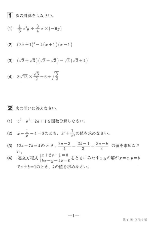 平成22年度入試過去問題 (第1回)(数学 問題)(1ページ目)|実践学園高等学校の入試過去問
