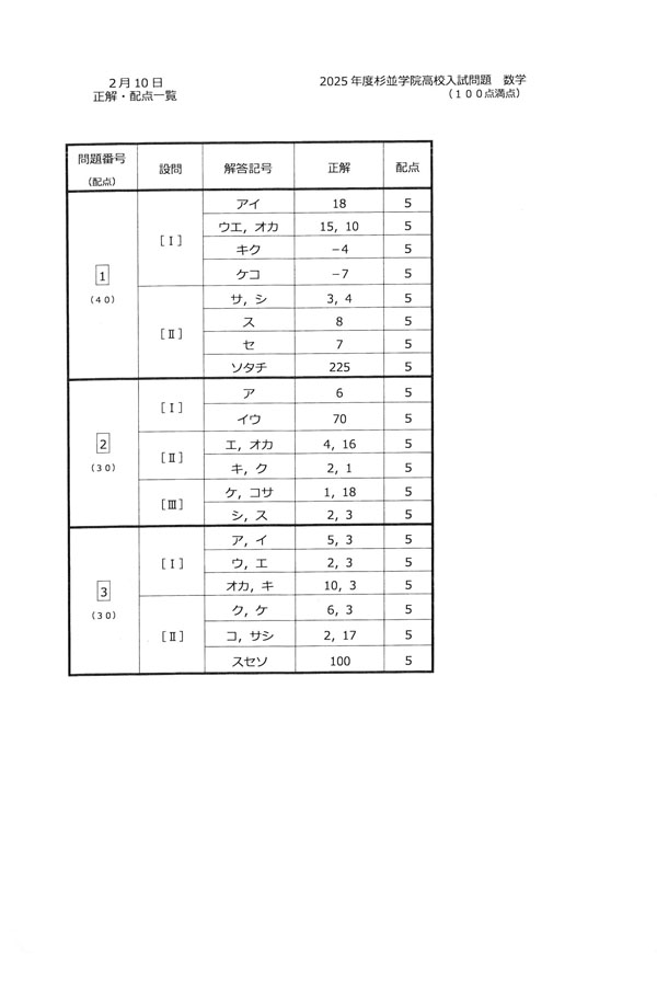 2025年度入試過去問題 (数学 解答)(1ページ目)|杉並学院高等学校の入試過去問